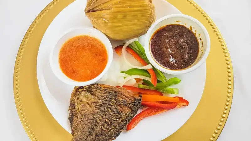 Kenkey: Discover the authentic taste of Kenkey, a traditional Ghanaian staple made from fermented corn dough, carefully wrapped and steamed to perfection. With its slightly tangy flavor and firm texture, Kenkey pairs perfectly with spicy pepper sauce, fried fish, or savory stews—offering a true taste of coastal Ghana in every bite.