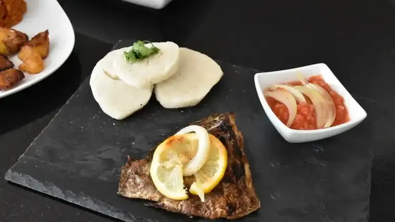 Banku: Delight in the classic pairing of Banku and Fried /Grilled Tilapia—soft, slightly tangy fermented corn and cassava dough served with perfectly seasoned, crispy fried tilapia. Accompanied by spicy pepper sauce and fresh garnishes, this iconic Ghanaian dish delivers a bold, satisfying blend of flavors that captures the essence of coastal cuisine.