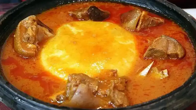 Fufu with Light Soup – A classic Ghanaian comfort dish.Silky fufu served alongside a flavorful, aromatic light soup made with tender meats or fish, garden-fresh vegetables, and a delicate blend of spices. Perfectly balanced, hearty, and satisfying, this traditional West African favorite is both wholesome and delicious.